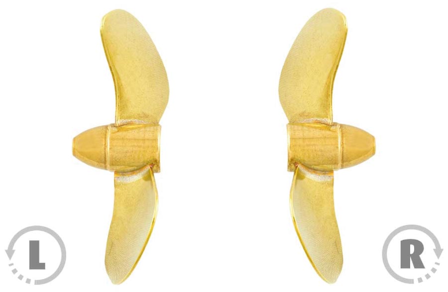 Hélice de bateau en laiton avec filteage pour monter sur l’arbre. Le sens de marche des hélices est vu de la poupe dans le sens de la marche.