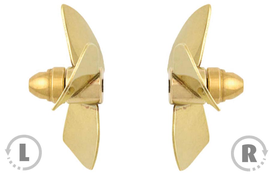 Hélice de bateau en laiton avec filteage pour monter sur l’arbre. Le sens de marche des hélices est vu de la poupe dans le sens de la marche.