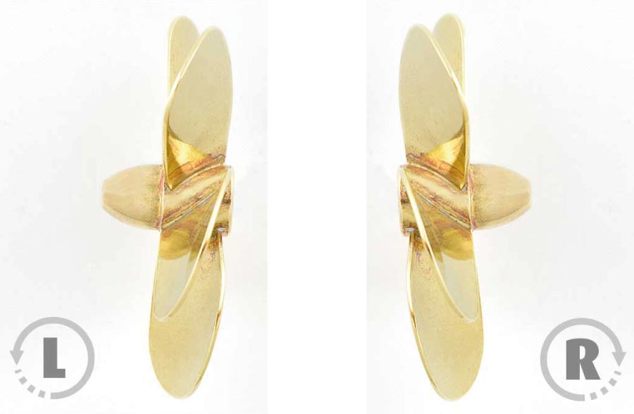 Hélice de bateau en laiton avec filteage pour monter sur l’arbre. Le sens de marche des hélices est vu de la poupe dans le sens de la marche.