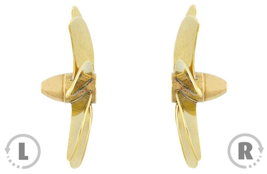 Hélice de bateau en laiton avec filteage pour monter sur l’arbre. Le sens de marche des hélices est vu de la poupe dans le sens de la marche.