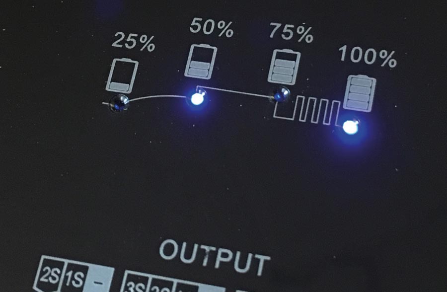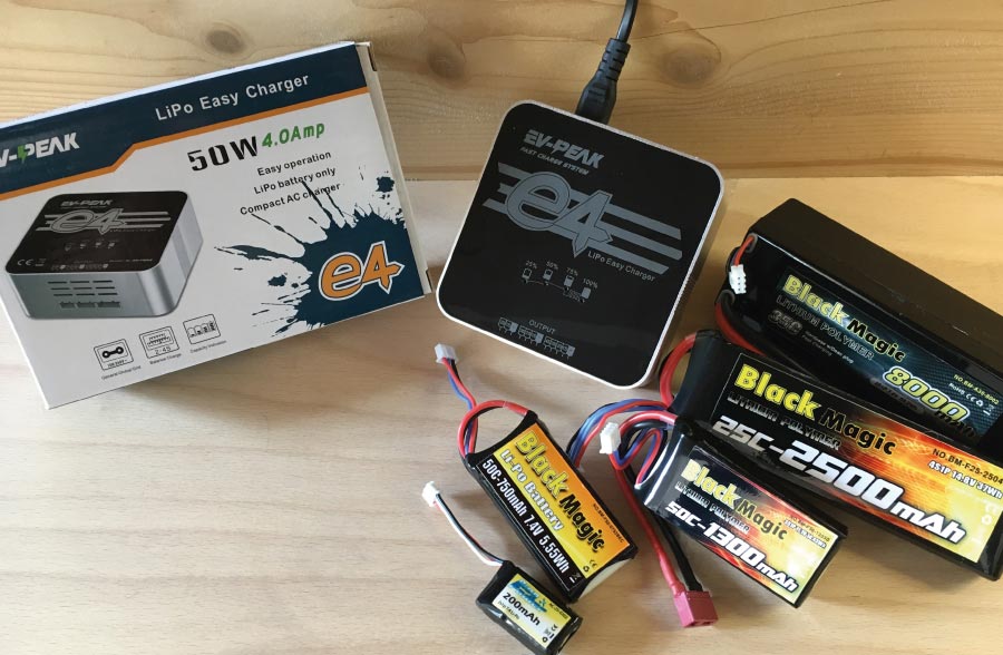 … Brancher l’accu avec la prise balancer sur le Eç, attendre qu’il est chargé complet, fini. Grâce à l’éléctronique et les componants modernes, le chargeur E4 de EV-Peak charge l’accu doucement et vraiment plein. Les quatre LED vous informe continuellement sur le statut de charges. Charger les LiPo peut être aussi simple que cela.