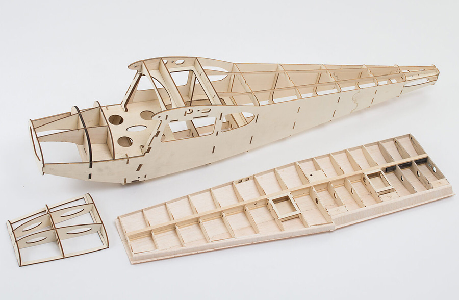 tous les pièces en bois, découpées au laser, tubes et joints, train d’atterrissage en époxy, pneus, train arrière dirigeables, intérieur de cockpit, vitre claire pour cockpit, petits pièces pour commandes, matériel pour le planchéiage, divers baguettes, aide de construction, instructions de montage en 3D.