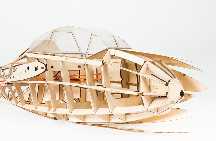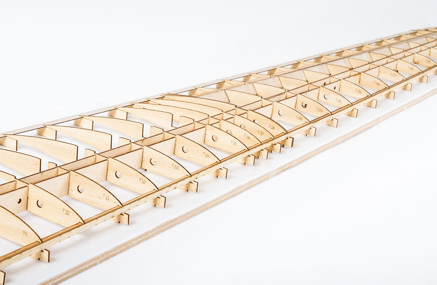 Le kit contient: Toutes les pièces en bois (principalement du contreplaqué) découpées au laser pour construire le fuselage, les matériaux de voilure et de bordage ainsi que pour la verrière du cockpit, tous les accessoires nécessaires tels que les baguettes de pin, les charnières, les vis, etc. et des instructions de montage détaillées et illustrées. Le Depronhelling est également inclus.