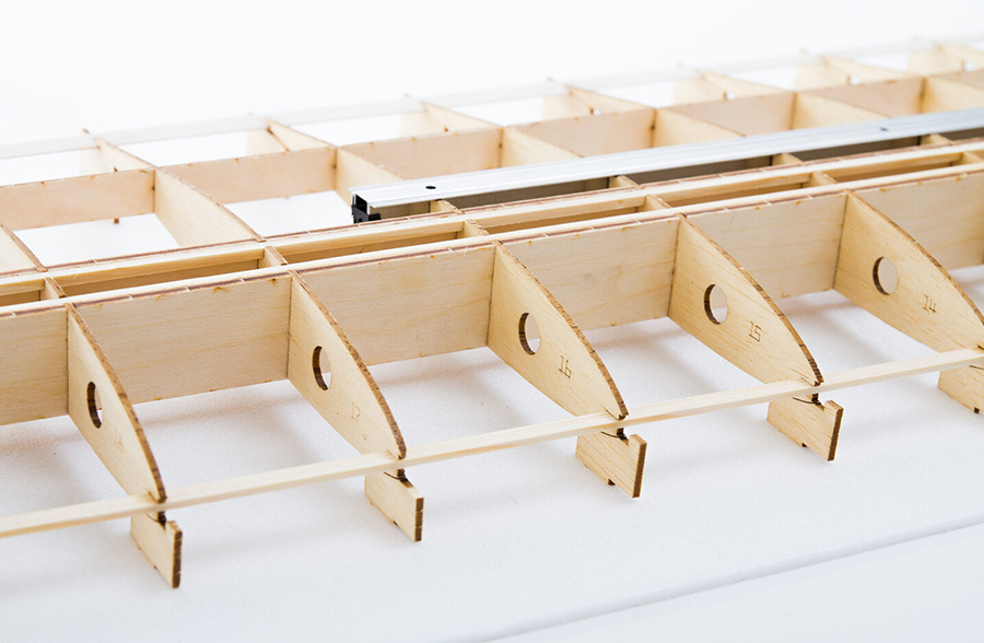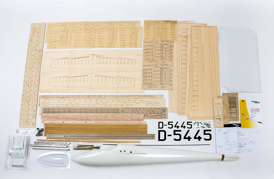 Ailerons déjà emballés, empennages en polystyrène recouverts de balsa, pièces de cockpit embouties, verrière, acier rond de 12 mm avec tube en laiton, volets de frein en deux parties, verrous d’aile, pièces embouties en contreplaqué, petites pièces et feuille de décalcomanie.