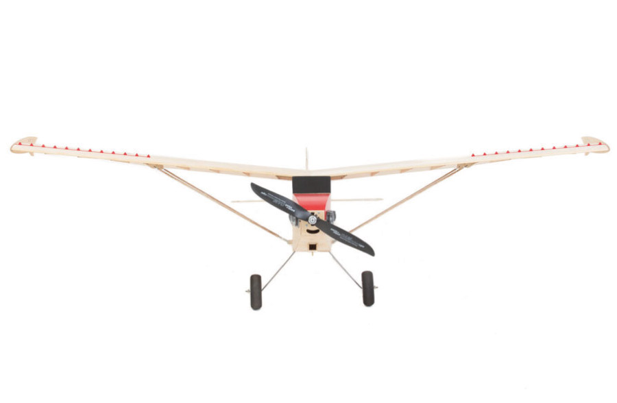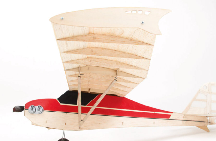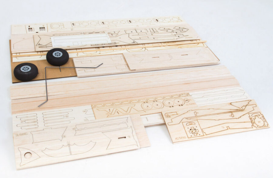 Le kit contient: tous les composants en bois découpé au laser, petits pièces, papier de couverture pour l’empenage, train d’atteriasse et roues, instructions de contruction en 3D.