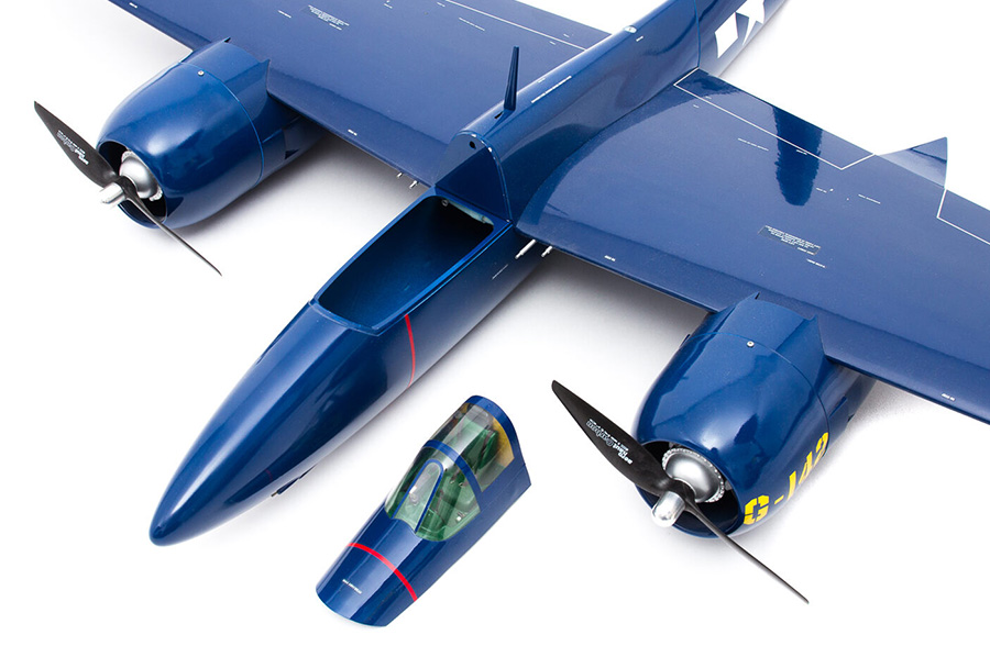 L’ancêtre de ce chat de race était un prototype de l’avion de chasse bimoteur Navy XF5F-1, qui n’a jamais été produit en série, mais qui a apporté à la société Grumman une expérience précieuse pour un développement ultérieur. Les avions décollant des bases terrestres étaient destinés à protéger le US Marine Corps. Le Grumman F7F 3 est un avion de chasse monoplace bimoteur de construction entièrement métallique avec des panneaux d’aile extérieurs rabattables pour le rangement du porte-avions et un train d’atterrissage tricycle rétractable. Deux moteurs P&W R 2800 34W d’une puissance de 1566kW ont servi d’unités d’entraînement. L’armement était composé de 4 mitrailleuses de calibre 12,7 mm dans le nez du fuselage et de 4 canons de calibre 20 mm dans les ailes. Au niveau de la mer, l’avion a atteint une vitesse maximale de 681 km/h et à une altitude de 6675 m 719 km/h. Aujourd’hui, les dernières machines survivantes sont utilisées par les passionnés d’avions anciens à différents jours de vol. Après avoir été vendues par l’US Marine Corps, certaines machines à courte portée ont été équipées de gros réservoirs dans le fuselage et sont encore utilisées aujourd’hui pour la lutte contre les incendies. Le modèle Tigercat est conçu pour être entraîné par 2 moteurs électriques à engrenages de la série 400/480 et une batterie de 8 à 10 cellules d’une capacité de 1,7/2,0 Ah. Avec cet équipement, le comportement de vol du Tigercat est proche de la réalité et la silhouette est impressionnante en vol. Les décollages et atterrissages sont faciles. Le modèle peut également effectuer des manœuvres acrobatiques simples. Le modèle a une construction mixte. Le fuselage et les nacelles du moteur sont en stratifié GRP, l’aile et l’empennage sont en bois de balsa. La construction globale est complétée par des pièces en plastique embouties, une verrière transparente, un cockpit, des nacelles de moteur et des mannequins de moteur radial. Les batteries de vol sont insérées à travers la verrière amovible. Comme les vrais Tigercats ont été pulvérisés avec des peintures brillantes, un filme thermocollante peut être utilisée pour recouvrir les ailes (Oracover n° 019). e modèle est contrôlé via les ailerons, la profondeur et le régulateur de vitesse.