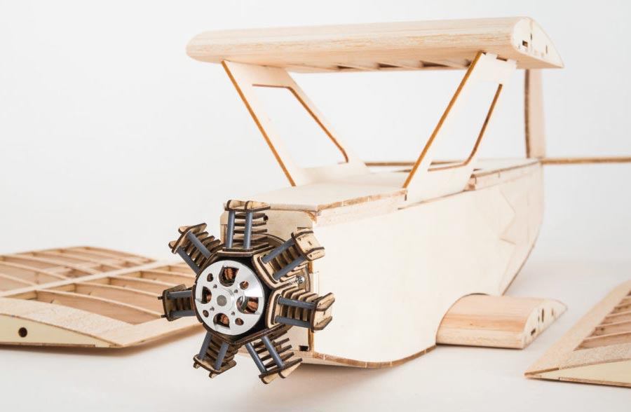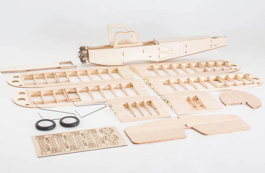 Toutes les pièces en bois découpées au laser nécessaires à la construction, les pièces de liaison, les pièces de châssis, les roues, diverses petites pièces, les instructions de construction 3D, la cale de construction, le moteur radial factice réaliste en kit.
