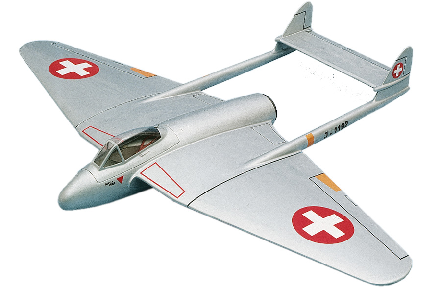 Le De Havilland DH 100 « Vampire » a été développé pendant la Seconde Guerre mondiale et a effectué son vol inaugural en septembre 1943. Cependant, il n’y avait plus d’opérations militaires. Néanmoins, le chasseur à réaction avec le « fuselage double » caractéristique a fait sensation dans les milieux militaires. L’une des conséquences en fut que l’armée de l’air suisse en mit 75 exemplaires (plus tard 100 autres) en service dès 1949. Ils ont été utilisés comme intercepteurs, plus tard, après conversion, également à des fins de combat au sol. À partir de 1966, le « Vampire » a été utilisé pour former des pilotes militaires fédéraux. Les derniers exemplaires n’ont été vendus à des acheteurs privés qu’en 1991. En tant que jet des jours pionniers de la propulsion à réaction, le DH 100 est parfaitement adapté comme modèle pour un modèle d’avion à propulsion par ventilateur électrique. Le guidage à faisceau court permet une efficacité d’entraînement élevée. Grâce à la surface alaire relativement grande, la charge alaire du modèle reste dans les limites. En raison de la configuration de l’aile médiane, le modèle peut être lancé à la main (utile à l’aide d’une corde en caoutchouc) et atterrir en toute sécurité sur son « ventre ».