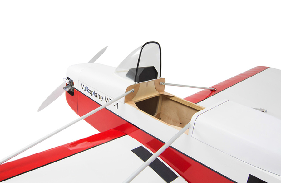 La construction du Volksplane VP-1 (également appelé Evans VP-1) remonte à l’initiative du Californien William Evans à la fin des années 1960. Il voulait créer un avion que n’importe qui pourrait construire avec des moyens simples afin de pouvoir s’adonner à l’aviation. A ce jour, il vend les plans de sa construction dans le monde entier.Selon les estimations, plusieurs plans de 10 000 personnes ont été construits. Une version biplace VP-2 n’a pas dépassé le statut de prototype. La maquette à l’échelle 1:2,5 a été construite par Philipp Gardemin selon les plans originaux. Toutes les dimensions ont été réduites exactement et à l’échelle. Les détails de la conception et de la construction ainsi que le choix des matériaux et des résistances ont été presque entièrement adoptés. Il en est résulté un grand modèle impressionnant et robuste en construction bois, qui impressionne par ses caractéristiques de vol sans problème et permet ainsi également une entrée facile dans la scène des grands modèles prototypiques. Le modèle peut être motorisé avec des moteurs à essence d’environ 33 cm3 ou de puissants entraînements électriques de 8s-Lipo ou Lion. L’authenticité maximale est obtenue avec le moteur boxer Saito FG57TS (n° de commande 7100/75) Il n’y a pas de limites à l’expansion individuelle du modèle au-delà de la portée du kit, les modèles appropriés peuvent être trouvés facilement avec une recherche sur Internet.