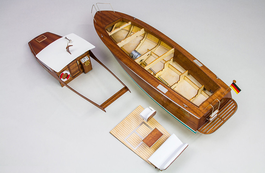 Kit d’un prototype de bateau à cabine des années 1960, construction entièrement en bois, structure de la cabine amovible, permettant un bon accès à la batterie, à la propulsion et à la télécommande. Toutes les pièces sont prédécoupées pour un montage rapide.