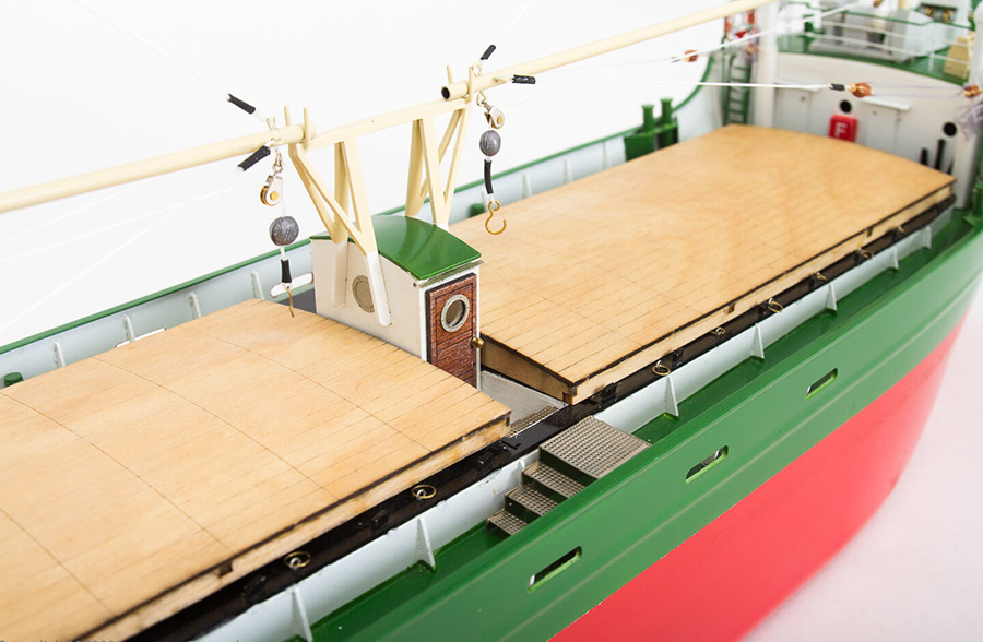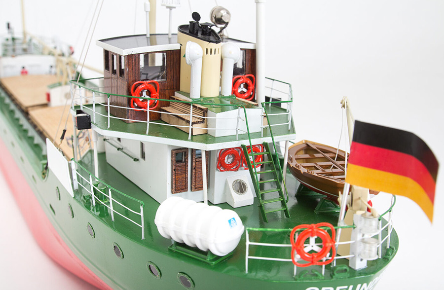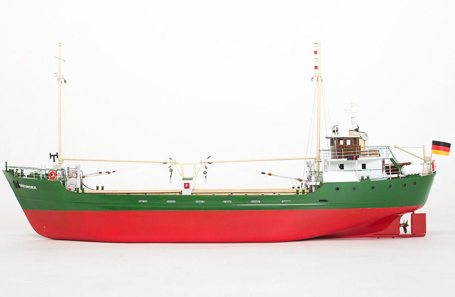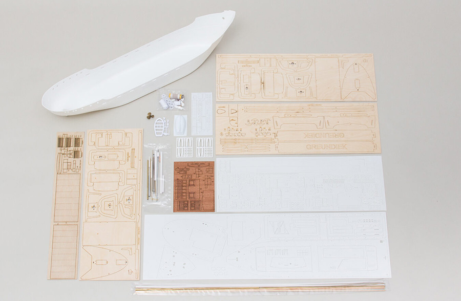Le modèle a été développé en utilisant tous les dessins disponibles et de nombreuses photos. Le kit se compose d’une grande coque stable en ABS avec des ouvertures fraisées pour les hublots et les dalots. Le pont et la structure complète sont constitués de pièces laser en ABS et bois. Toutes les pièces sont gravées au laser avec précision. Les nombreux équipements complètent l’apparence du Greundiek. Bien que l’original ait été utilisé comme modèle pour le kit et son équipement, le modèle offre également suffisamment de possibilités pour créer votre propre version du Greundiek.