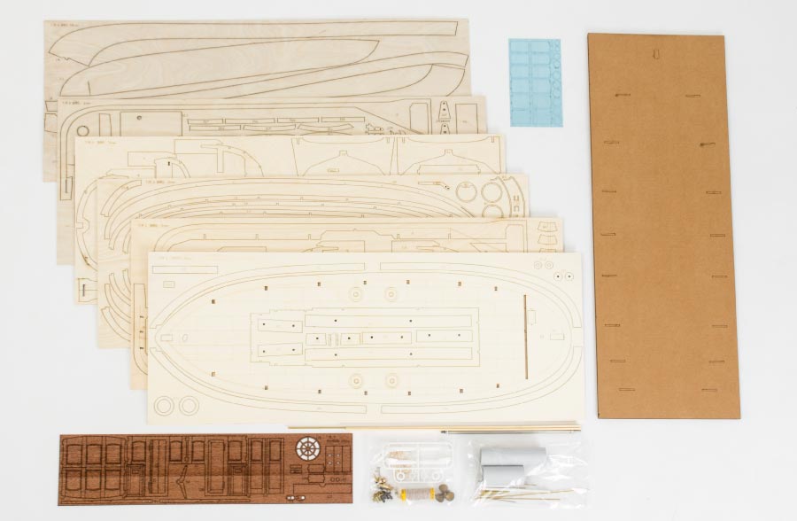 Toutes les pièces en bois nécessaires à la construction, l’arbre du navire, le gouvernail, la cale de construction, un jeu de ferrures, des pièces gravées et des instructions de construction 3D détaillées.