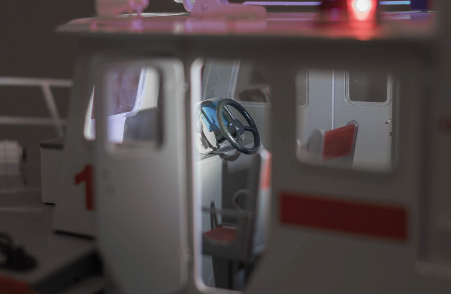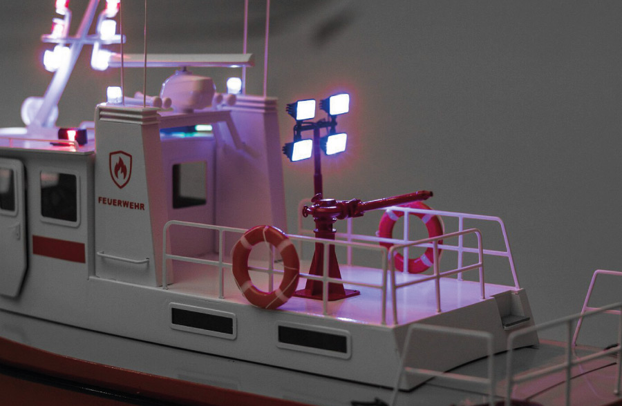 Das Boot kann voll funktionell ausgestattet werden. Alle Lampenkörper können mit LED bestückt werden, die Lackdrähte verschwinden komplett im Mast und Ausleger und werden zentral im Rumpf verschalten. Im Bausatz ist bereits ein Beleuchtungssatz für die nautische Beleuchtung, den Suchscheinwerfer und das Blaulicht enthalten. Der weitere Ausbau der Beleuchtung ist mit Hilfe des LED-Sets 5677/51 machbar.