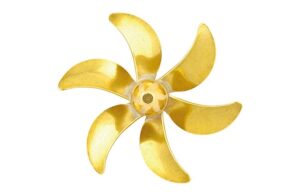 Schiffspropeller aus Messing mit Gewinde zum Aufschrauben auf die Schiffswelle. Die Laufrichtung der Propeller wird vom Heck in Fahrtrichtung aus gesehen.